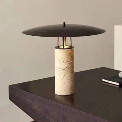Munie d'un abat-jour en métal plat et circulaire au-dessus d'un socle en pierre taillée, le mélange de métal noir mat et de pierre beige sublime l'espace avec délicatesse. Rehaussant votre décor sans effort, elle offre un effet très décoratif aussi bien allumée, qu'éteinte.