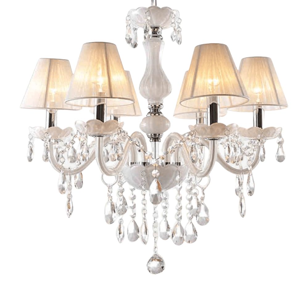 La structure gracieuse de ce lustre cristallin diffuse un coloris blanc chatoyant, qui se pare de multiples pampilles classiques en cristal, qui attirent le regard, et projettent la lumière à travers la pièce. Les six abat-jours en tissu blanc plissé comme à l'ancienne, atténuent l'éclat scintillant afin de créer une ambiance chaleureuse et douce dans votre salon, ou votre salle à manger.