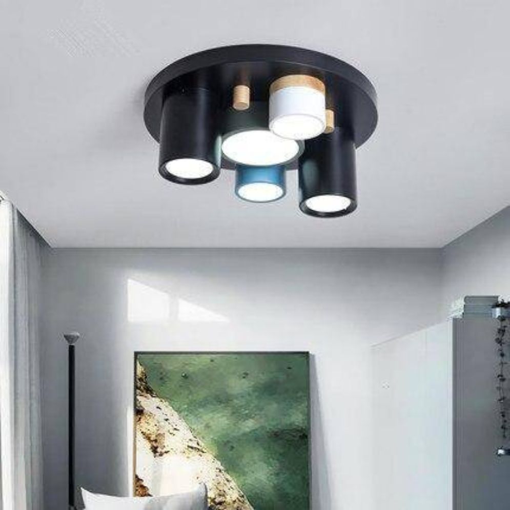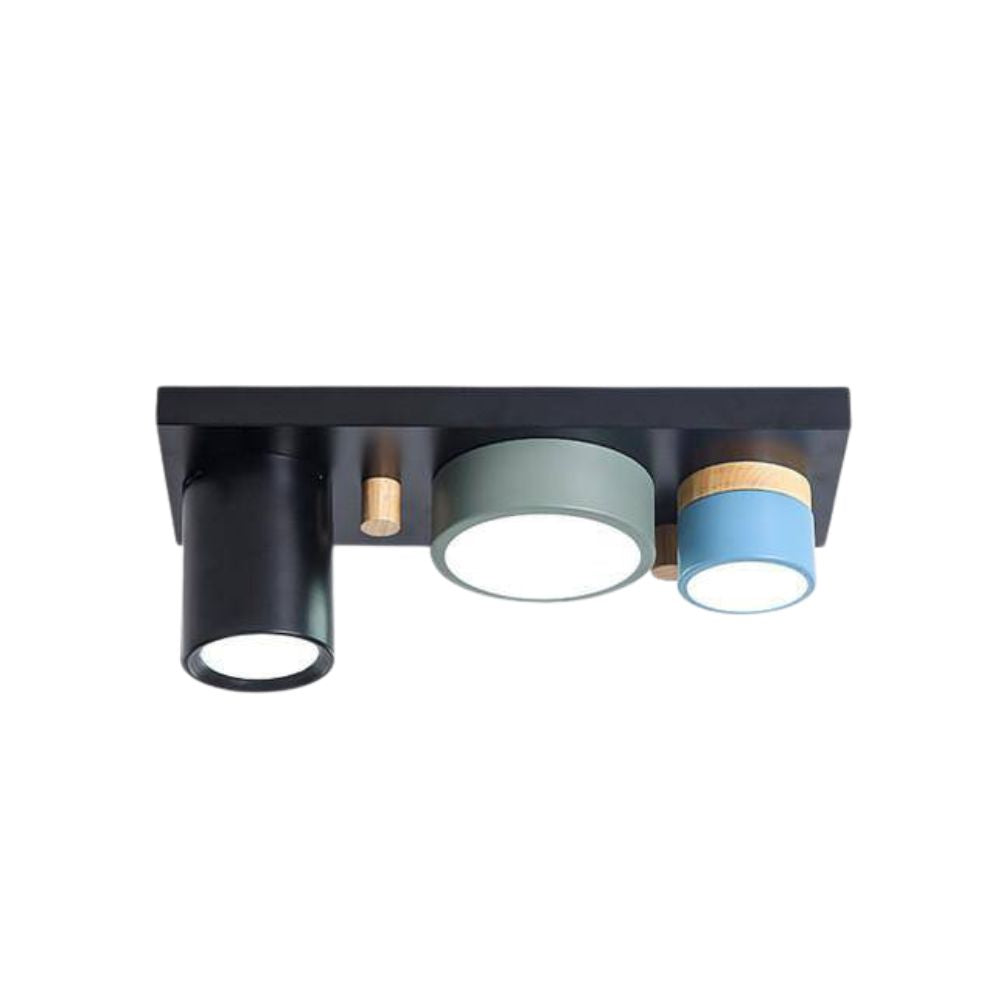 Sous le mélange audacieux des différentes couleurs et matières qui composent cet ensemble décliné en plusieurs modèles, votre plafond sera rehaussé d'une note de design moderne et convivial. Son apparence mélange les spots cylindres en bleu, bois clair et vert olive. Le tout soutenu par un socle d'encastrement arrondi.
