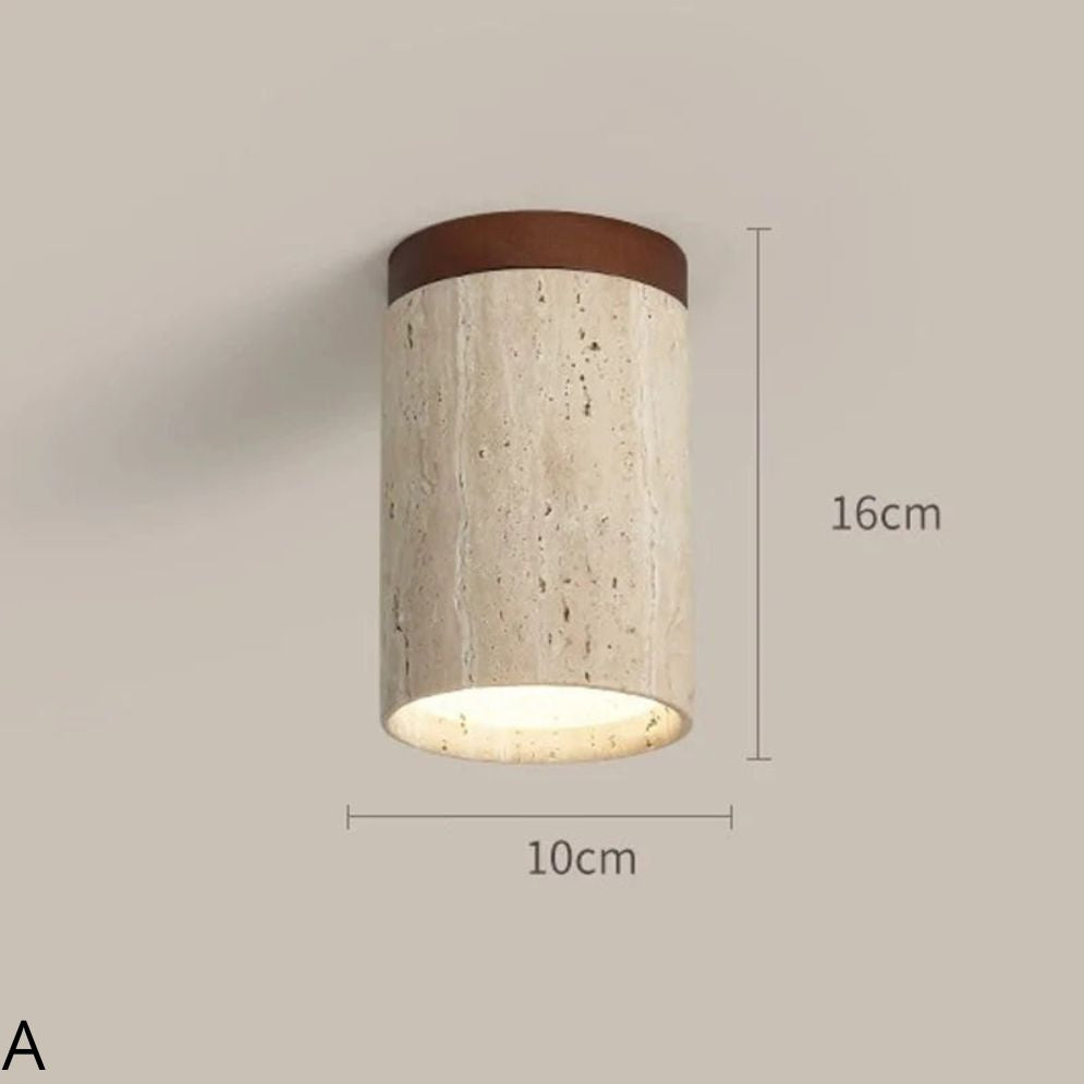 La base supérieure, faite de cuivre elle aussi naturelle apporte une touche de chaleur et d'élégance qui contraste harmonieusement avec la texture brute et irrégulière de la pierre, tout en soulignant sa silhouette cylindrique épurée. Proposé en trois modèles distincts, dont un avec un abat-jour en forme de cloche.