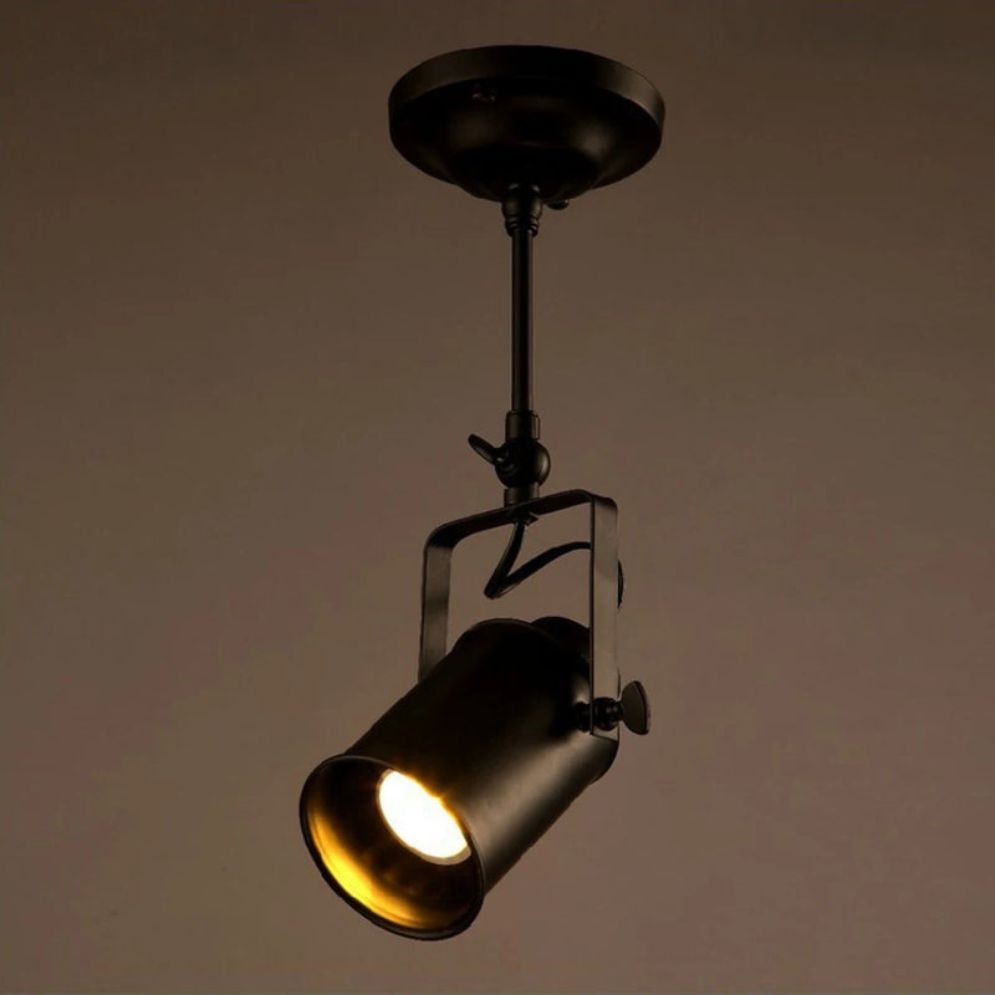 C'est un modèle qui se fixe au plafond comme au mur. L'éclairage focal et directionnel permet d'illuminer avec précision ce que vous désirez mettre en avant. Pour l'ampoule, un modèle à culot E27 est ce qui convient. Privilégiez un modèle de type Edison à filament visible pour renforcer l'ambiance vintage intemporelle de cette lampe noire !