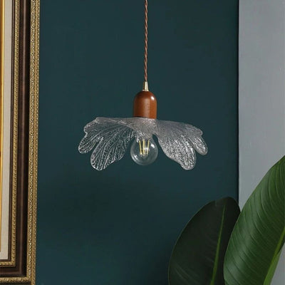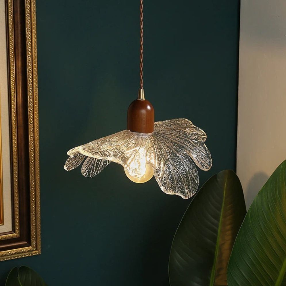 Cette suspension en verre mêle l'authenticité du bois qui entoure son culot, à la délicatesse d'un abat-jour en verre texturé prenant la forme d'une fleur.