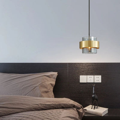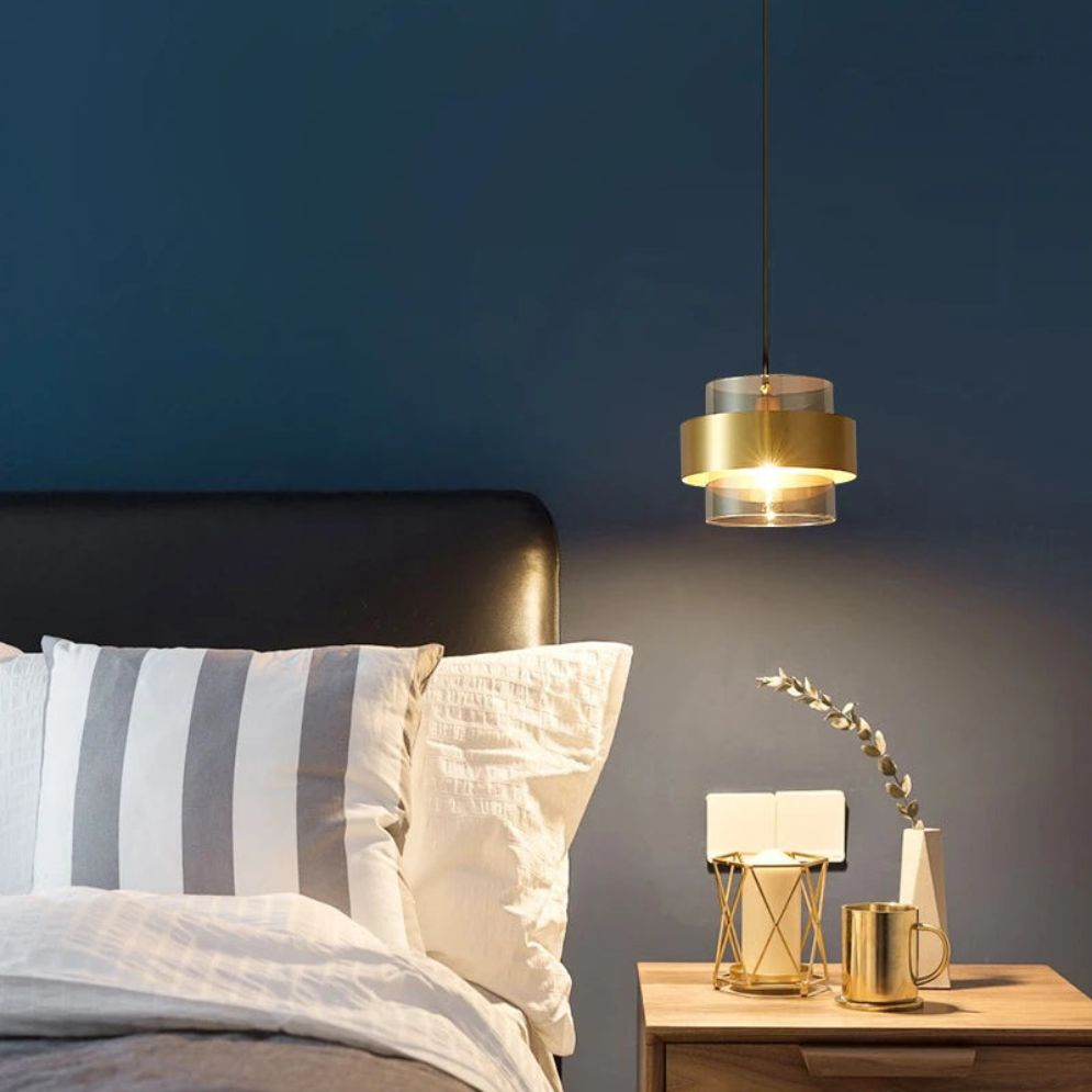 Ce modèle est une création unique de la part des designers contemporains. Sa forme réinvente les codes du design industriel avec une touche de luxe moderne ! Vous apprécierez sa double structure avec un anneau doré autour du cylindre de verre cristallin. diffusant une lumière chaude.